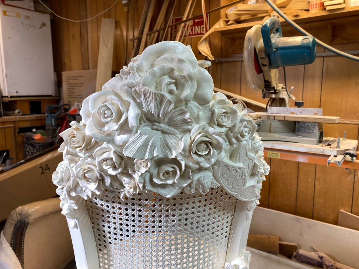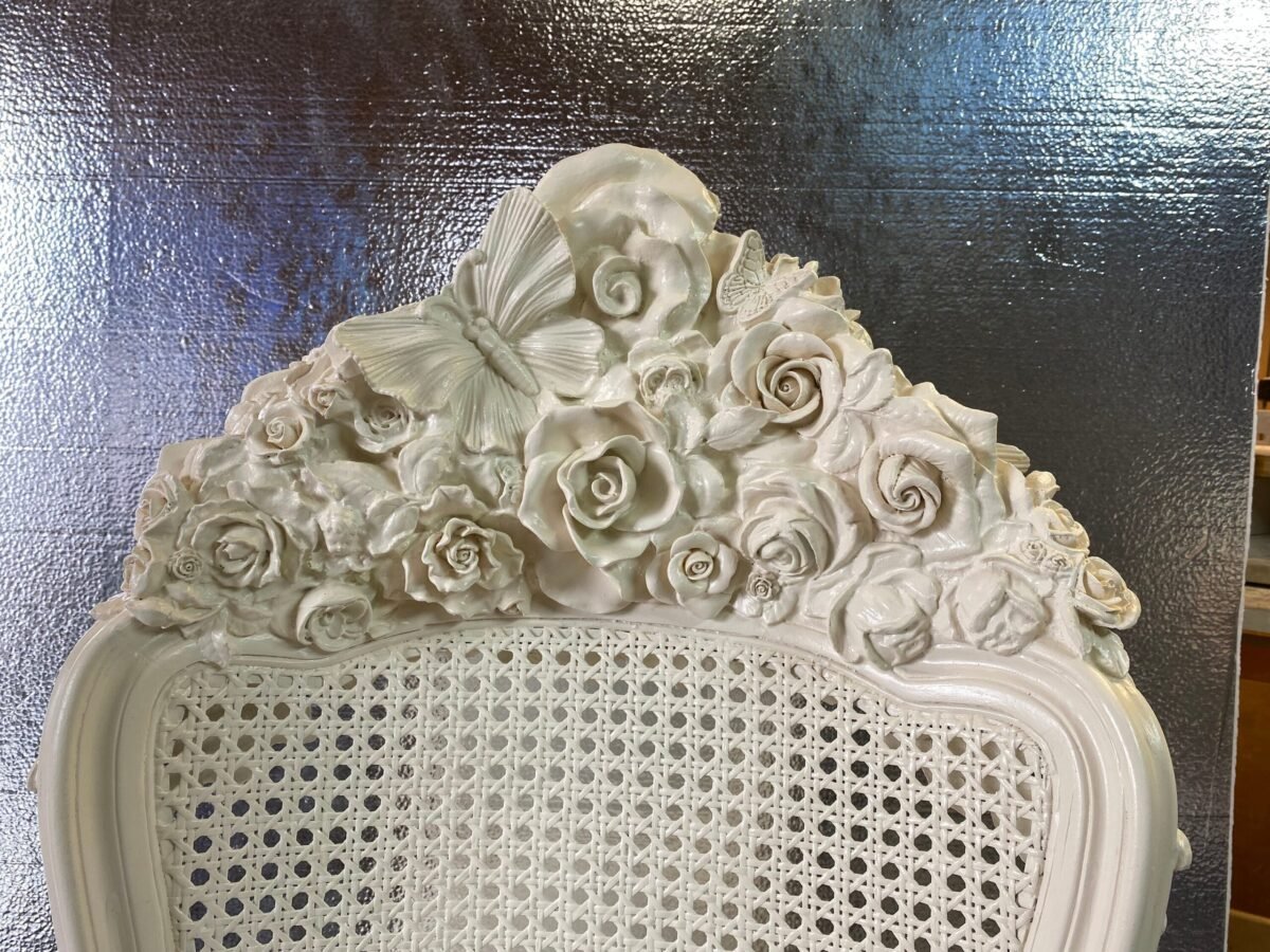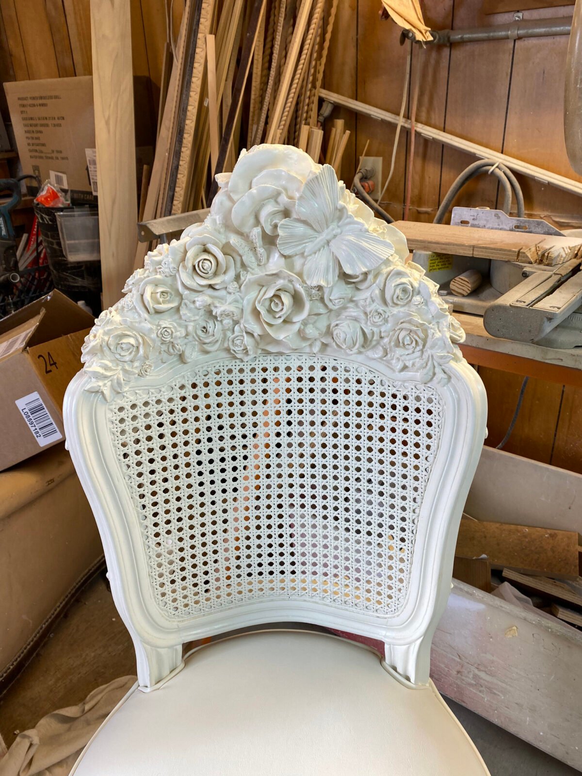 Shown with a antique white faux finish with water based safety paints and a soft brown glaze with other steps. My version of cream gold multi step finish.