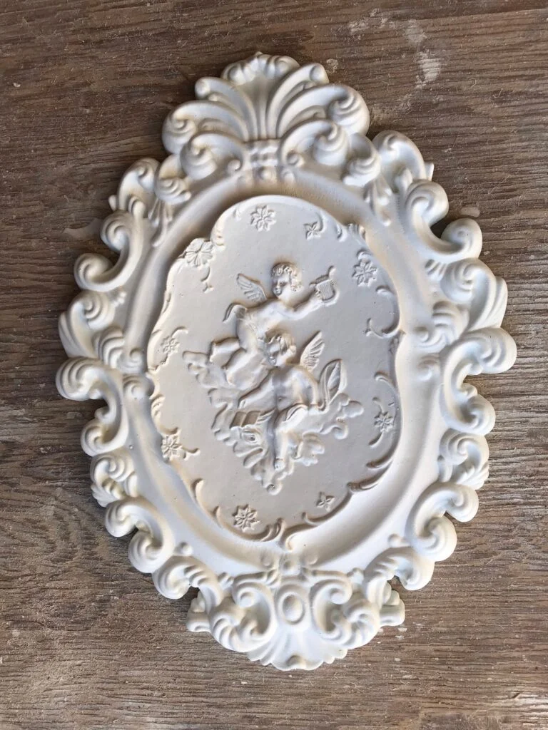 Beginning with a metal victorian antique french replica switch plate with 2 switch holes. I added my cherub and roses and leaves made of resin. Fixed with jb weld glue. Filled around the added roses and cherub decoration, then Primed, painted and then gold, finally sealed with clear coat.