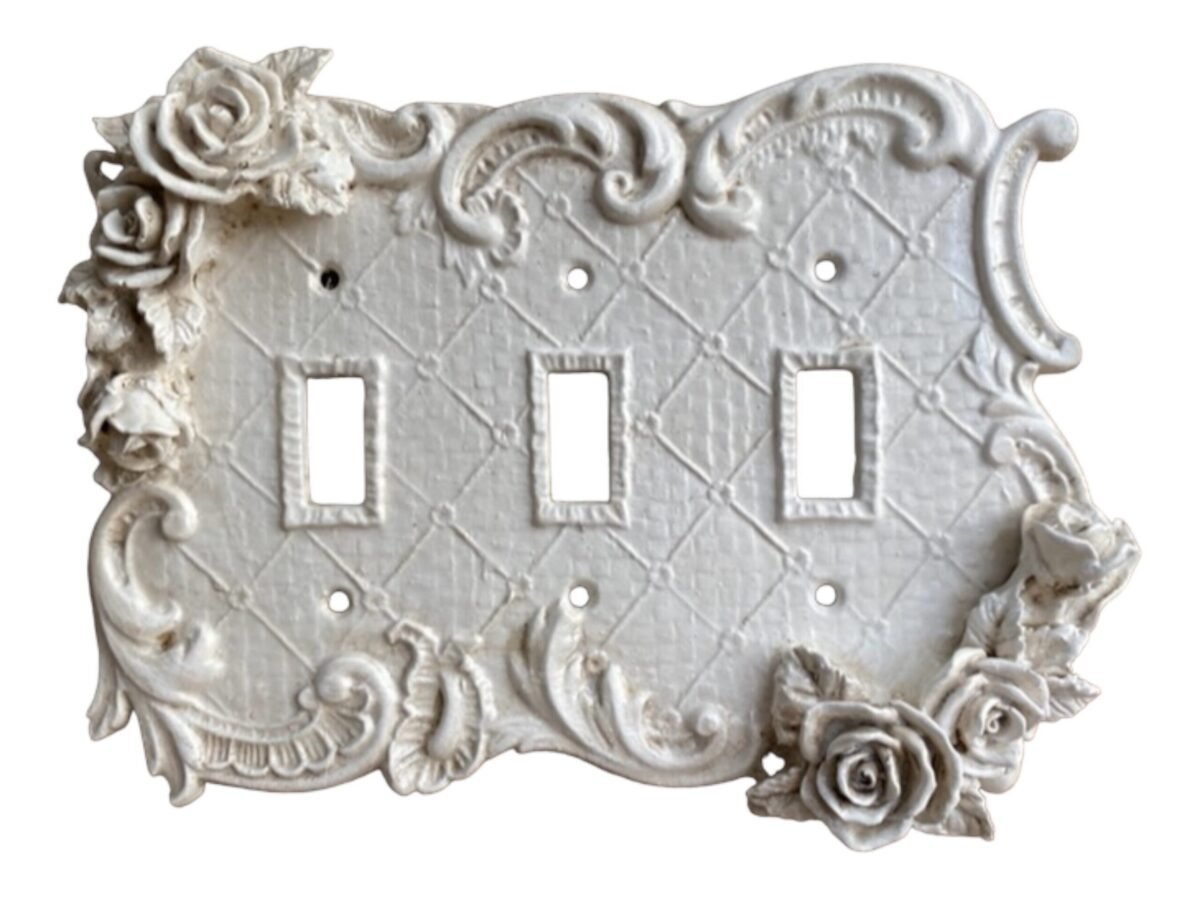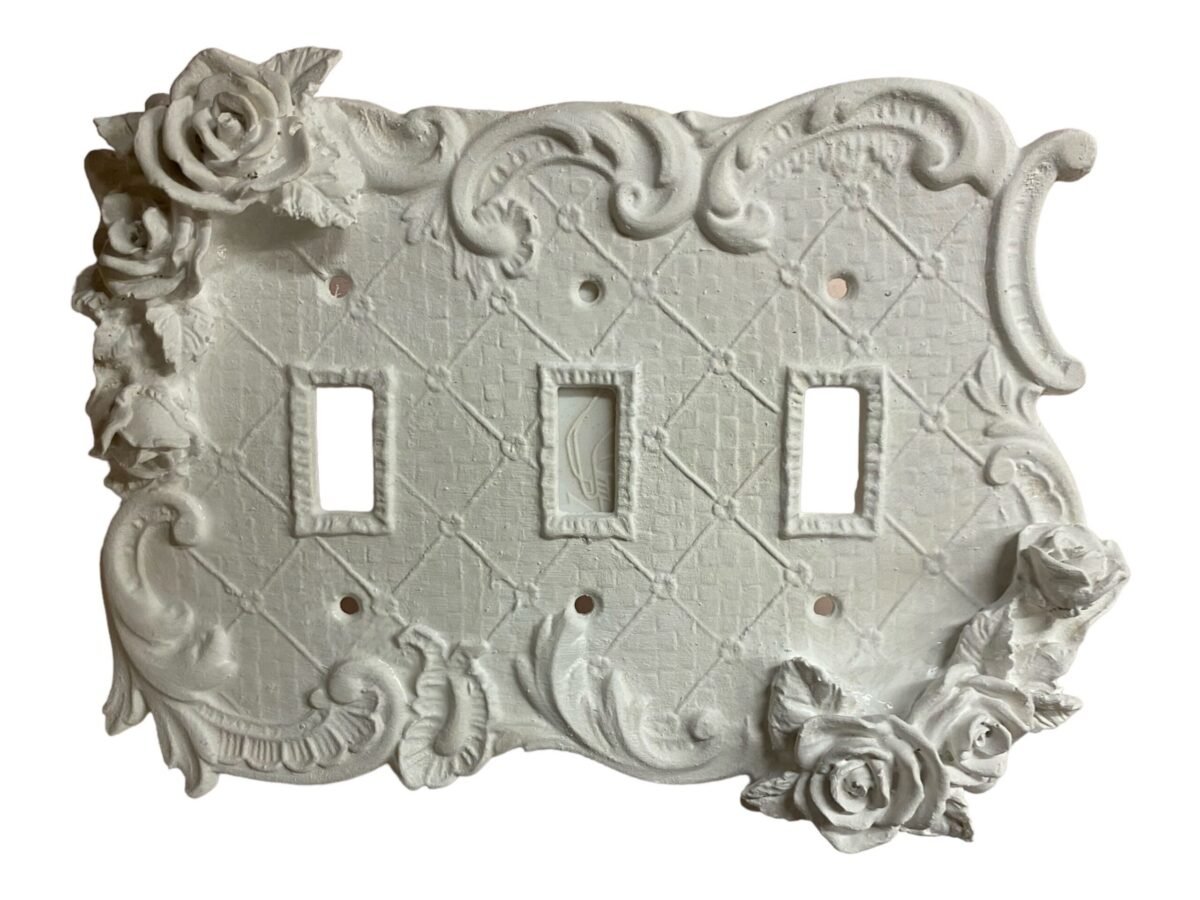 Beginning with a metal victorian antique french replica switch plate with 3 switch holes. I added my resin roses and leaves with jb weld glue on top of the switch plate. Filled around the added roses decoration, then Primed, painted, glazed with brown aging, following with my oyster wash, then white brushed on the high spots, then gold, finally sealed with clear coat.