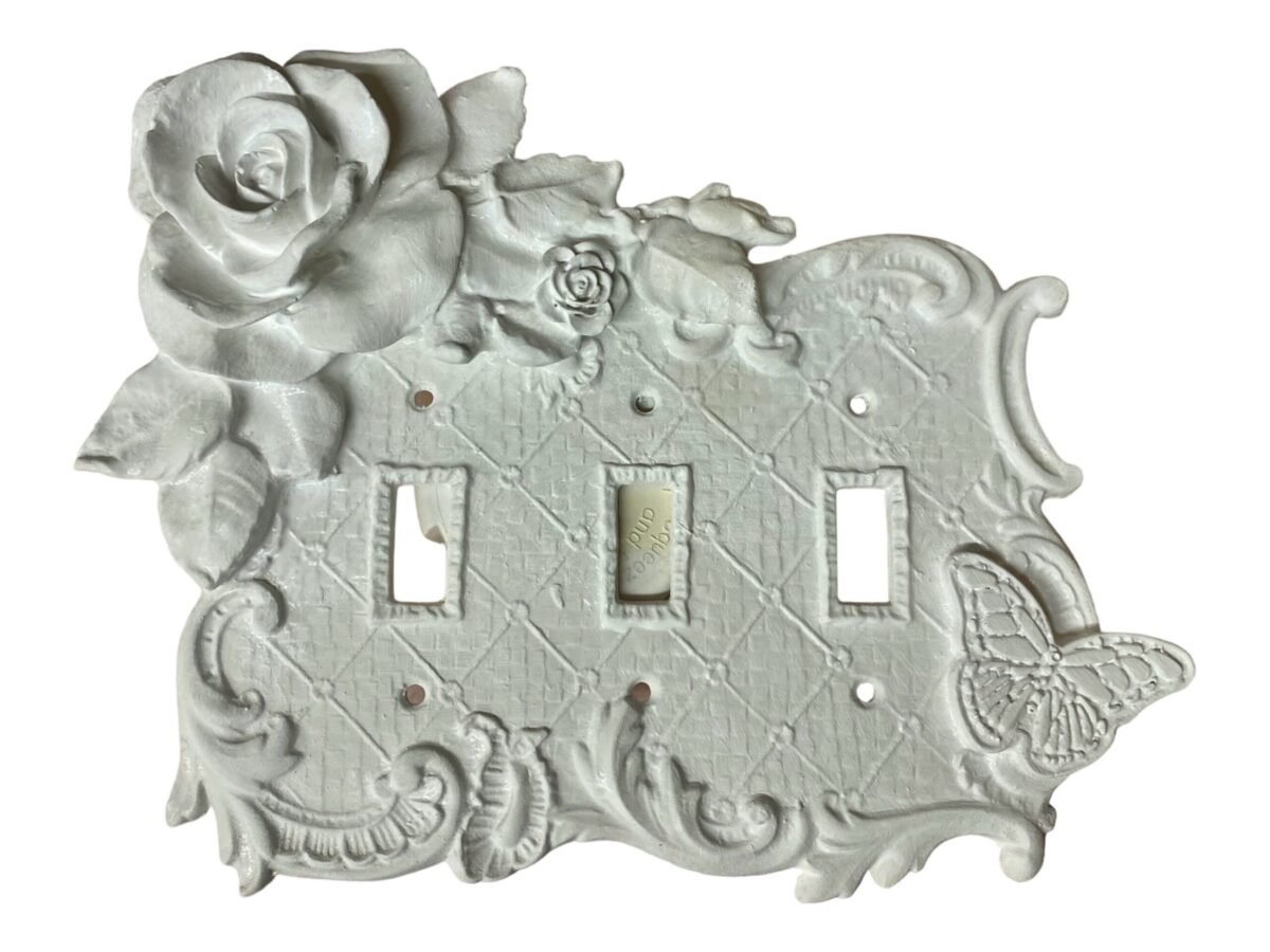 Beginning with a metal victorian antique french replica switch plate with 3 switch holes. I added my resin roses and leaves with jb weld glue on top of the switch plate. Filled around the added roses decoration, then Primed, painted, glazed with brown aging, following with my oyster wash, then white brushed on the high spots, then gold, finally sealed with clear coat.